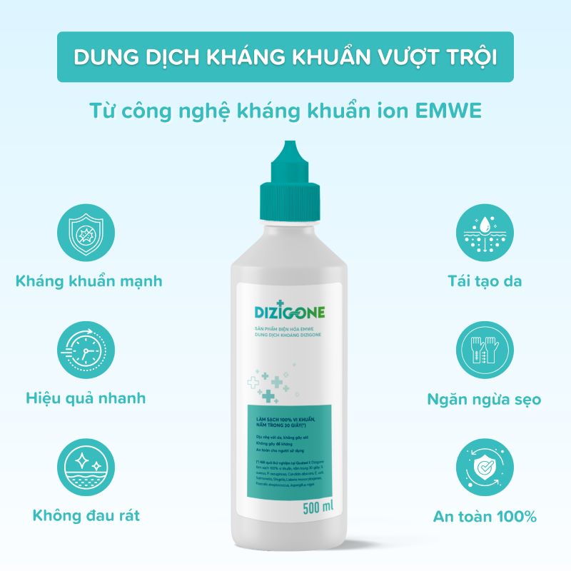 Dizigone là dung dịch kháng khuẩn thế hệ mới với những đặc tính vượt trội: HIỆU LỰC MẠNH MẼ, TÁC DỤNG NHANH CHÓNG và AN TOÀN TUYỆT ĐỐI cho người sử dụng. Dizigone là sản phẩm tiên phong tại Việt Nam ứng dụng công nghệ kháng khuẩn EMWE® tiên tiến từ Châu Âu, có khả năng tiêu diệt 100% vi khuẩn, virus, vi nấm gây bệnh thường gặp CHỈ TRONG VÒNG 30 GIÂY mà không gây đau, xót cho cơ thể. Dizigone giúp các tổn thương da liễu mau lành một cách tự nhiên, ngăn ngừa tối đa nguy cơ để lại sẹo.